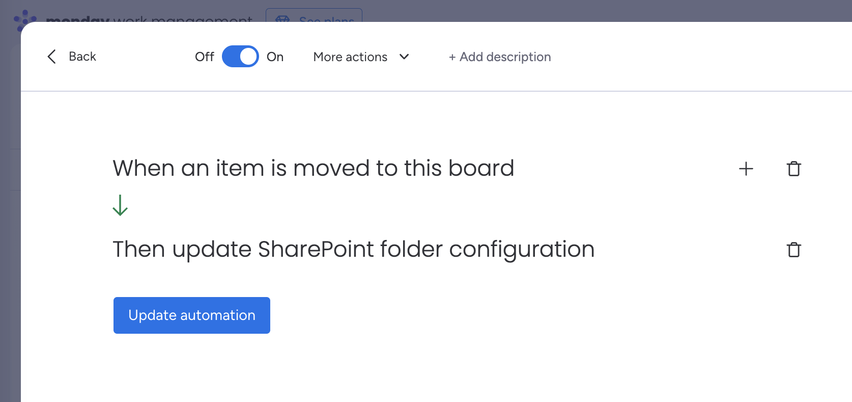 One advantage of using the custom recipe builder is that you can add related automations in sequence, for example, you can update the configuration, then rename the folder in SharePoint: