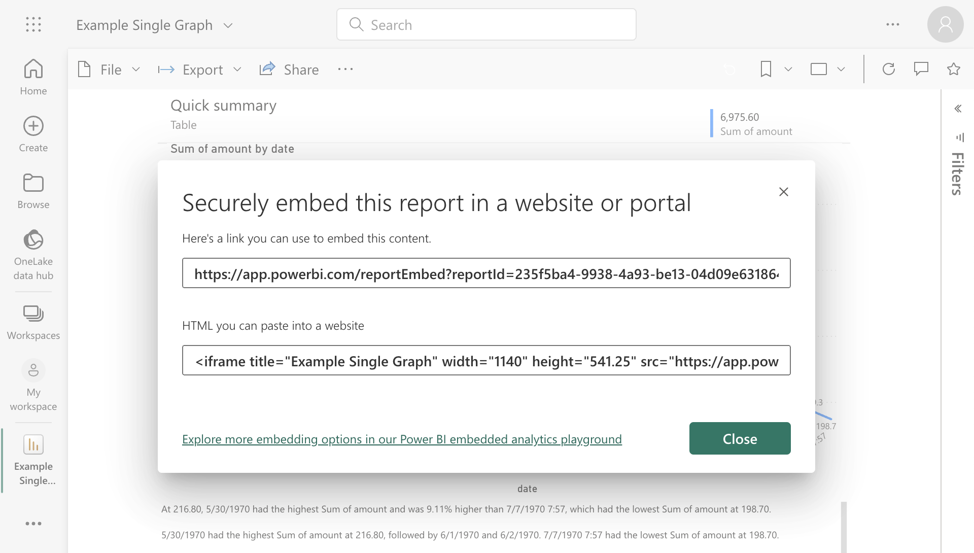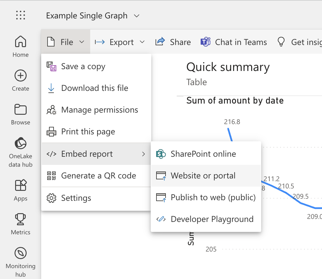 In the File menu, select Embed report, then Website or portal