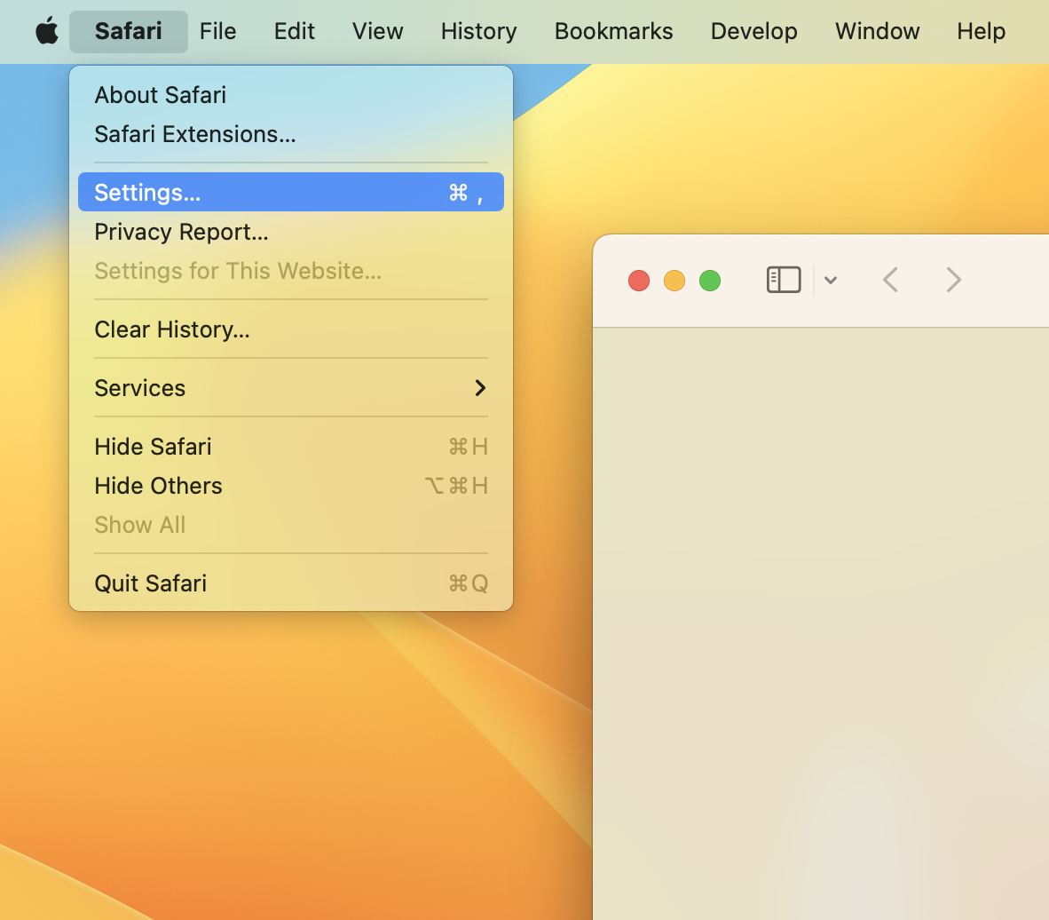 From the Safari menu, choose Settings… (or keyboard shortcut ⌘ + ,)