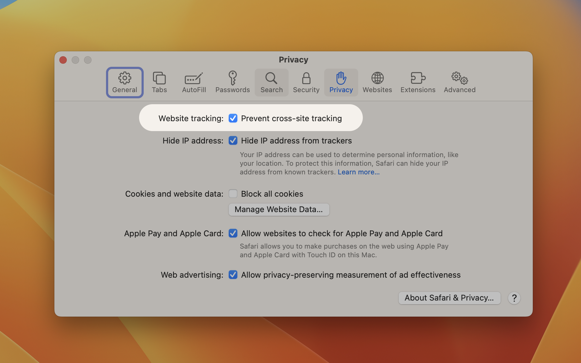 Then select Privacy and uncheck Website tracking: Prevent cross-site tracking